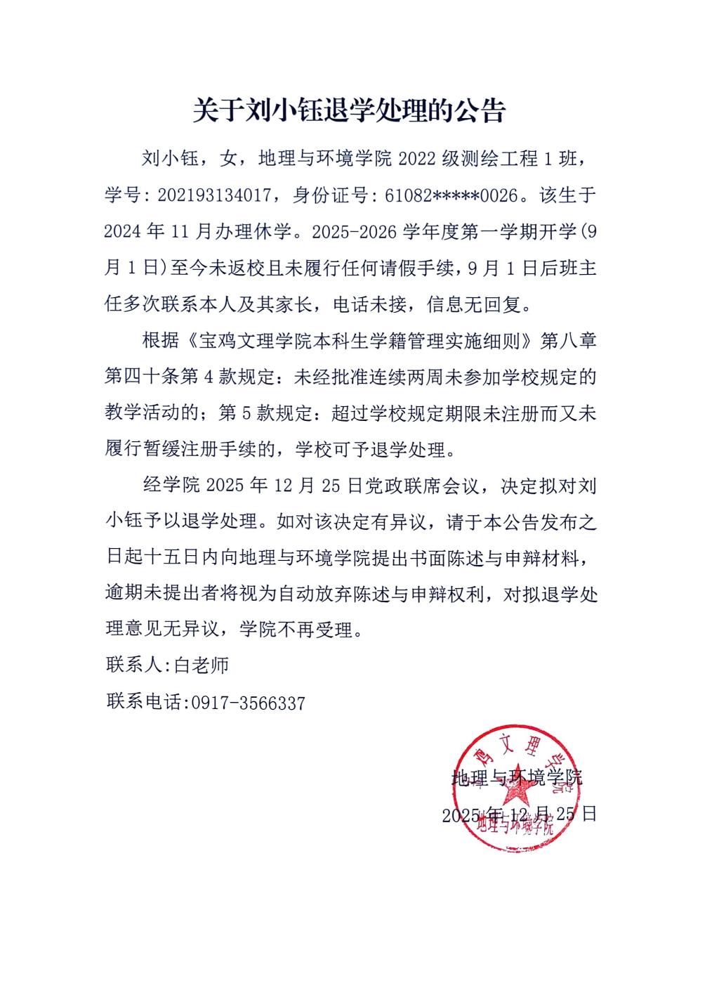 关于刘小钰退学处理的公告