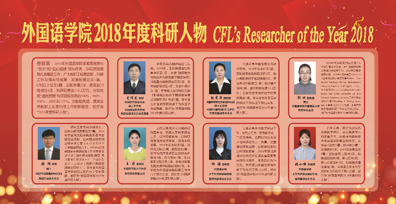史传龙对各研究所及参评年度科研人物的教师所提交材料的情况进行了汇报评审委员会依据学院出台的相关文件进行了认真细致评审在对研究所的考核评审中二语习得研究所、陕西文化翻译研究所被评为优秀等次,比较文学与世界文学研究所被评为良好等次。在对2018年度科研人物的评审中,史传龙耿秀萍、郭琪、张硕、王婷、郝娟、张小梅七位教师当选年度科研人物