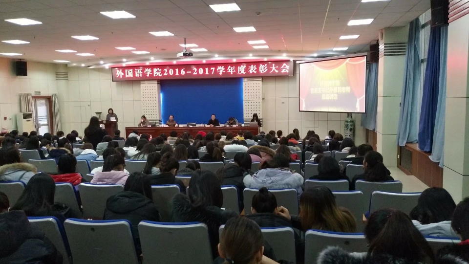1227日下午,外国语学院在新校区木铎厅召开了2016-2017学年度表彰大会。院党政领导、全体辅导员、班主任及300余名学生参加了会议,大会由党总支副书记苗亚静主持。