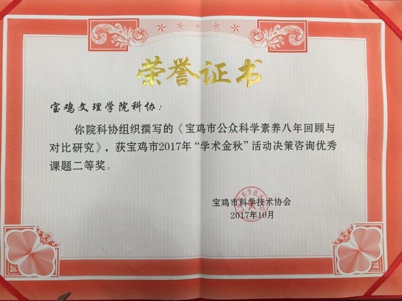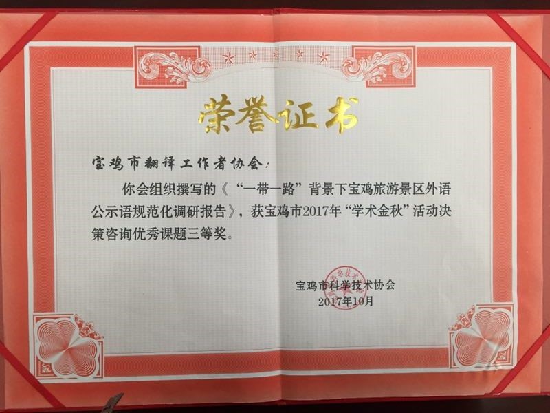 近日,在宝鸡市2017年度“学术金秋”决策咨询优秀课题表彰大会上,全市征集的26项咨询课题共评选出优秀论文8篇。其中我校科协和宝鸡市翻译工作者协会(挂靠我校)选送的2篇论文“宝鸡市公众科学素养八年回顾与对比研究”和“‘一带一路’背景下宝鸡旅游景区外语公示语规范化调研报告”分别获得二等奖和三等奖,宝鸡市翻译工作者协会秘书长—我院教师李伟博士应邀作了大会交流发言。