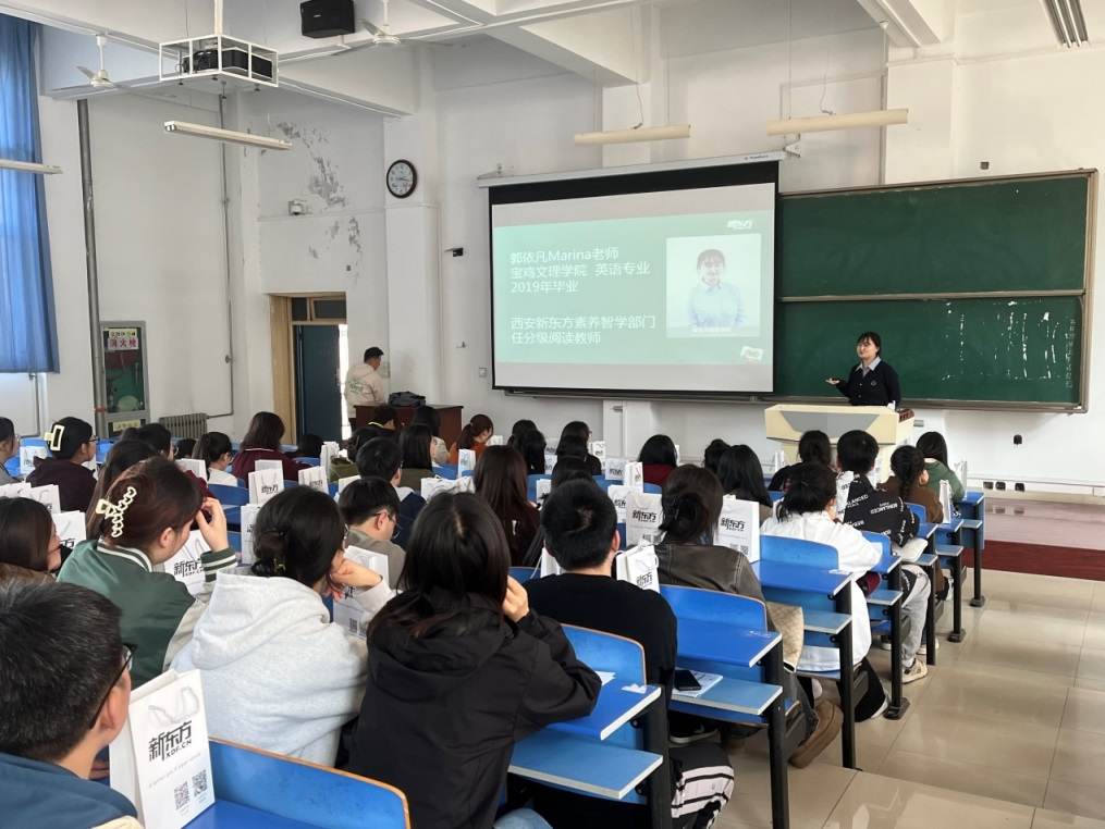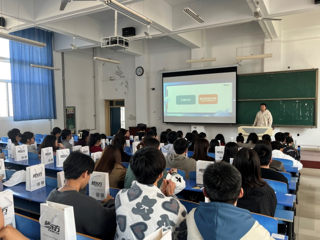 3月25日下午,新东方西安学校在立心楼420教室举办校园宣讲会。外国语学院副院长冯琳、专任教师黄龙飞、专职辅导员韩磊以及来自我校的24届毕业生100余人参加了此次活动。