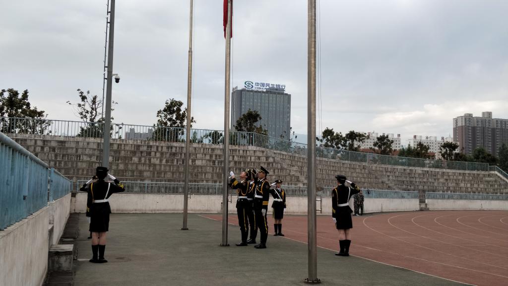 升国旗仪式于6:40准时开始。校国旗班踏着庄严矫健的步伐护送着五星红旗进场。伴随着义勇军进行曲的奏响,五星红旗冉冉升起。同学们面对国旗,庄严肃立,行注目礼。升国旗仪式结束后,2017级学生翻译一班学生许泽圆以“青春红五月,携手一起走”为题进行了国旗下的演讲,表明对建设更强大中国的决心。段振业在总结讲话中勉励全体学生在红色五月中追忆革命先烈的同时,要树立远大的爱国主义信念,不忘国耻,牢记使命,为实现中华民族伟大复兴而不懈奋斗。