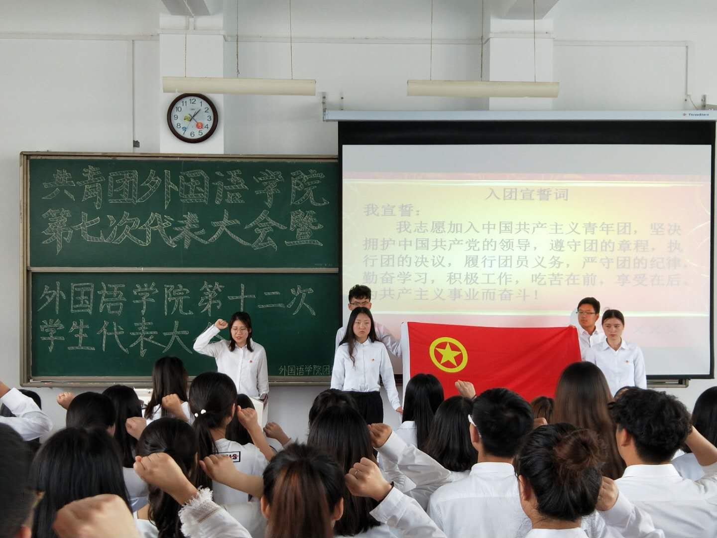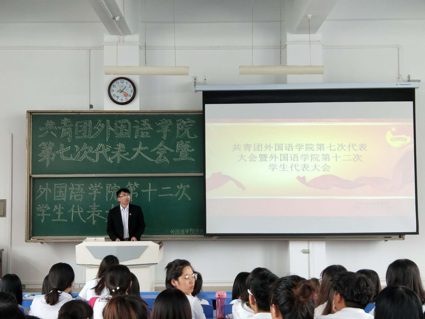 在新校区立心楼408教室召开共青团外国语学院第七次代表大会暨外国语学院第十二次学生代表大会。院党总支副书记苗亚静、团总支书记段振业及团员代表、学生代表100余人参加了会议。