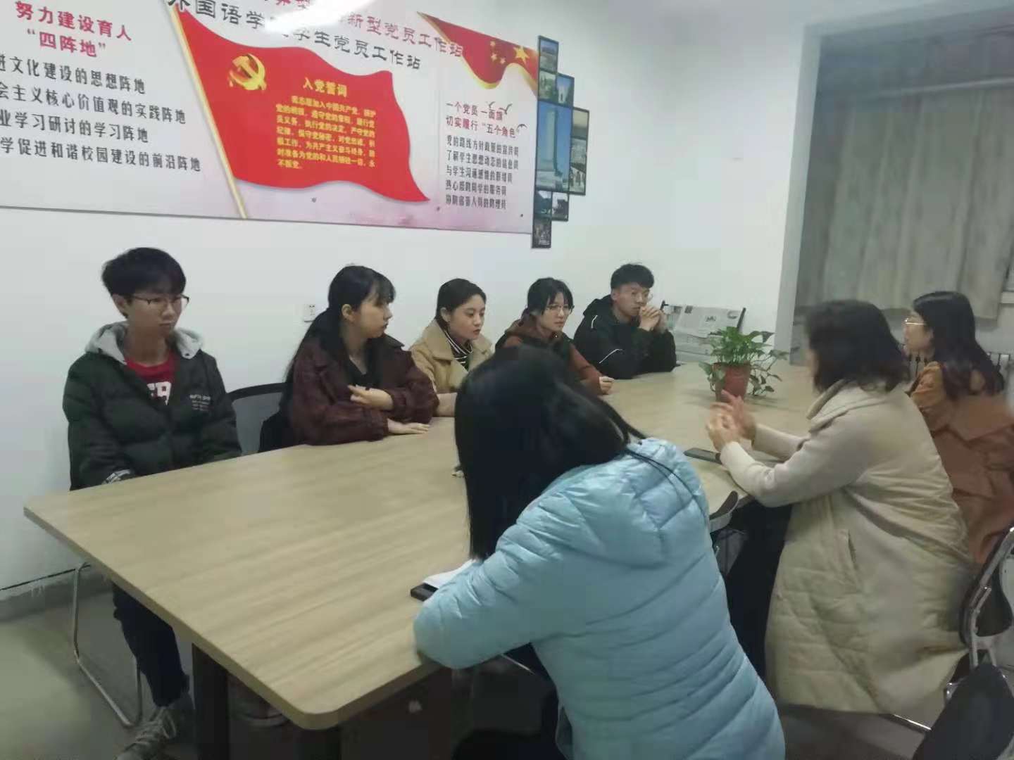 11月4日,外国语学院在9号公寓党员工作站召开了少数民族学生座谈会。院党总支书记孙勇民、辅导员滕筝、王娟参加了此次座谈会。