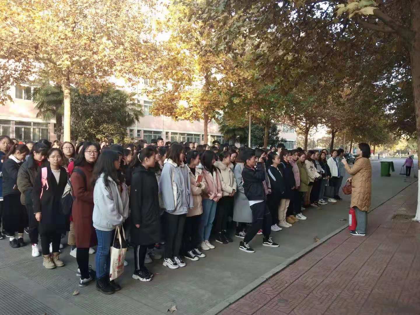 11月19日,外国语学院在学生公寓十号楼举行消防灭火及应急疏散演练。演练开始前,院党总支书记孙勇民强调了此次活动的重要性,要求同学们面对火灾时做到不慌、不乱、有条不紊,在日常学习和生活中严格遵守本校规定,杜绝不安全事件发生。随后,保卫处王能辉、张峰两位老师就消防安全隐患、火灾报警、逃生基本知识、灭火器使用方法四个方面作了详细讲解,指导同学们进行逃生演练并示范灭火器的使用方法。20日,在立心楼408教室分别组织观看了消防安全警示片。影片从火灾数据报告、典型案例回顾、火灾事故教训三个方面入手,展示了火灾的引发因素、逃生误区和严重后果,对增强同学们的火灾防范意识具有促进作用。23日,外国语学院院长王卫强带领办公室人员对所有办公场所、实验室和教室中的安全隐患逐一排查,并认真听取了关于冬季防范火灾方面的工作汇报。在检查中,他强调各办公室要采取有效措施加强用电安全管理,积极联系相关部门对已过期的灭火器进行更换或加压,切实消除安全隐患。