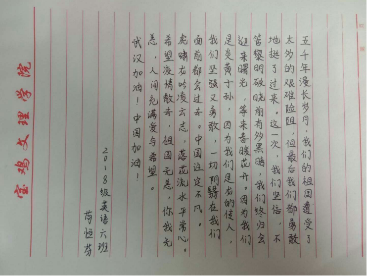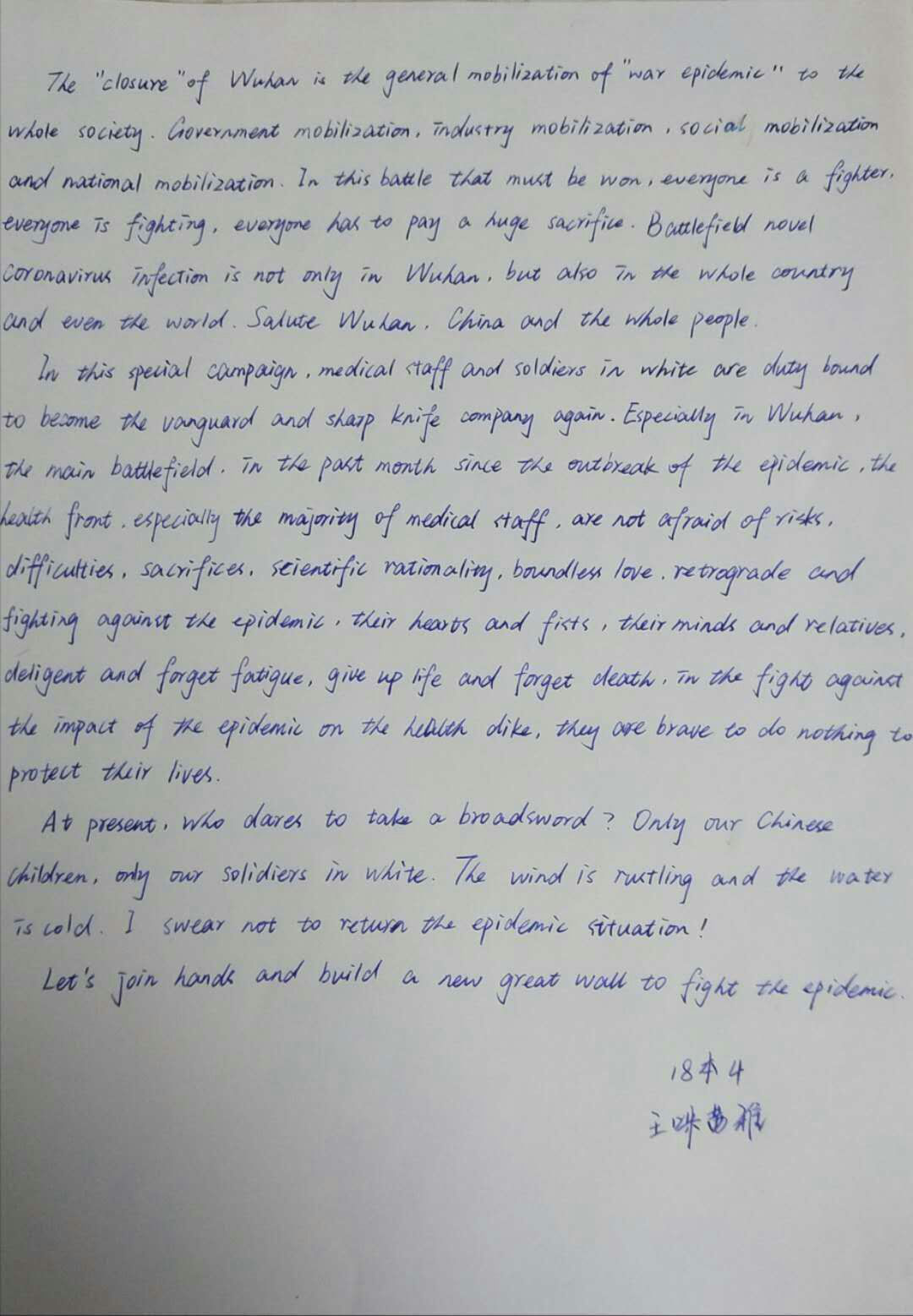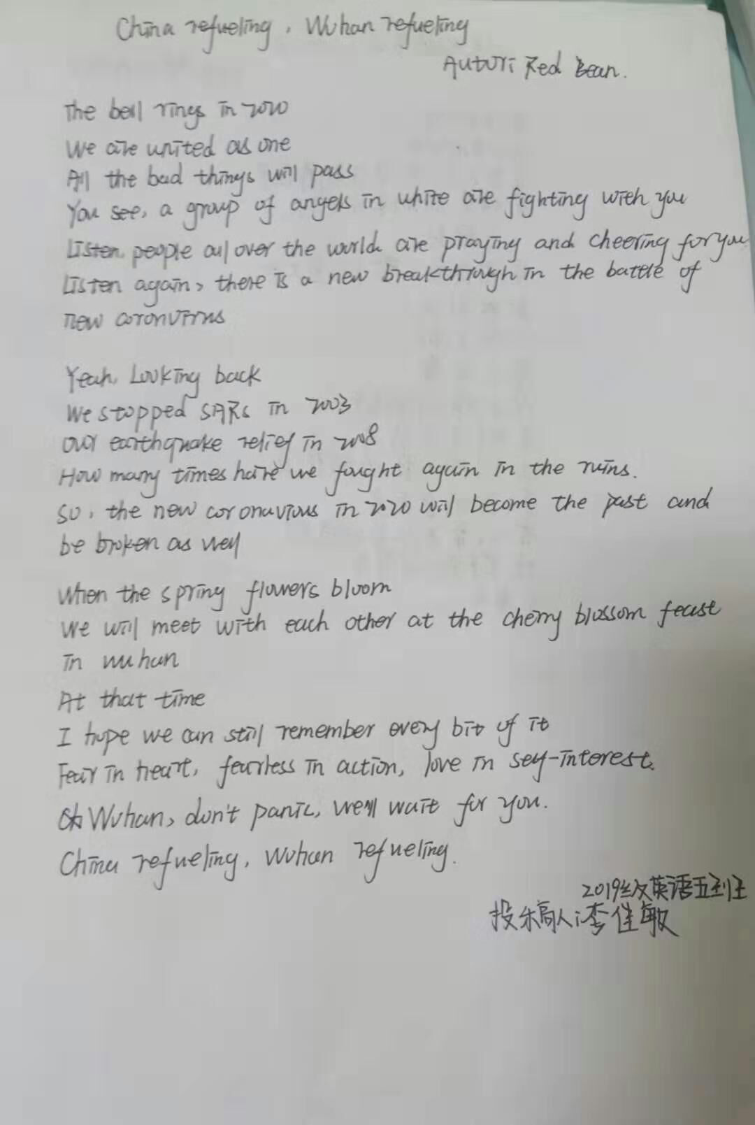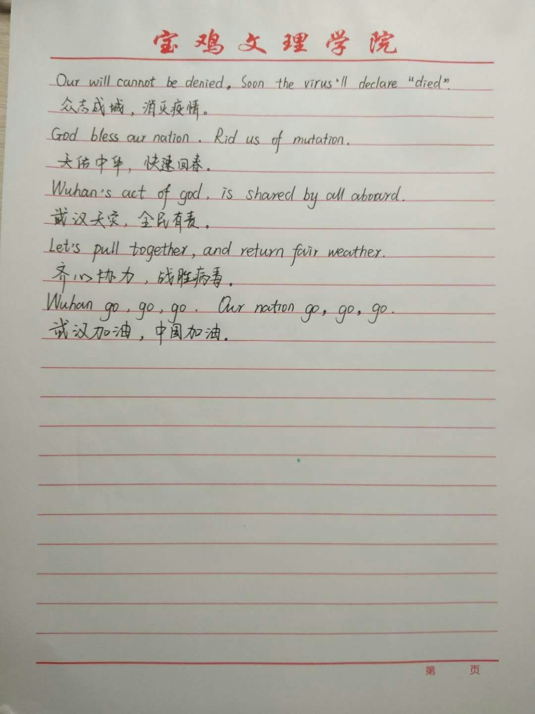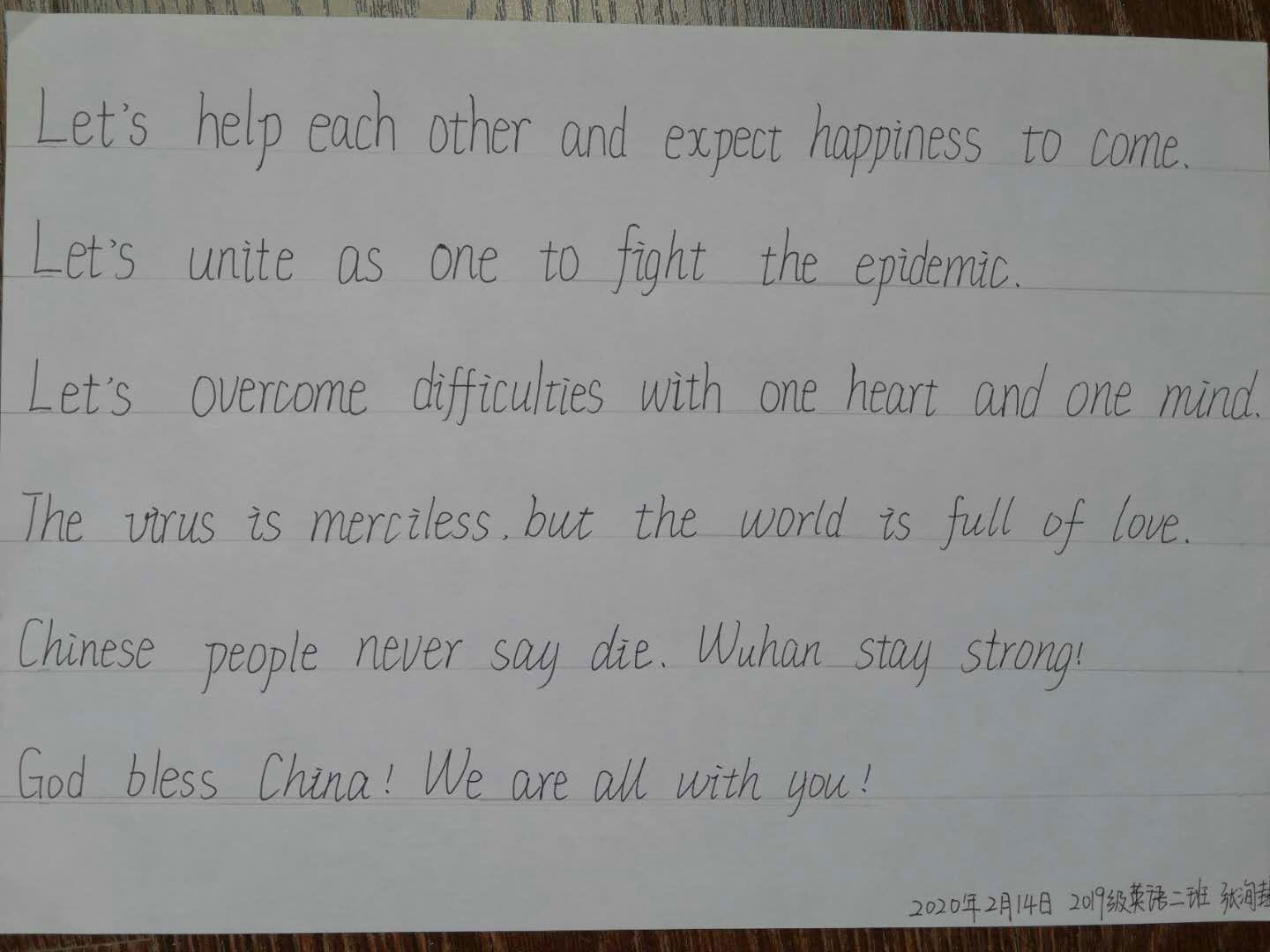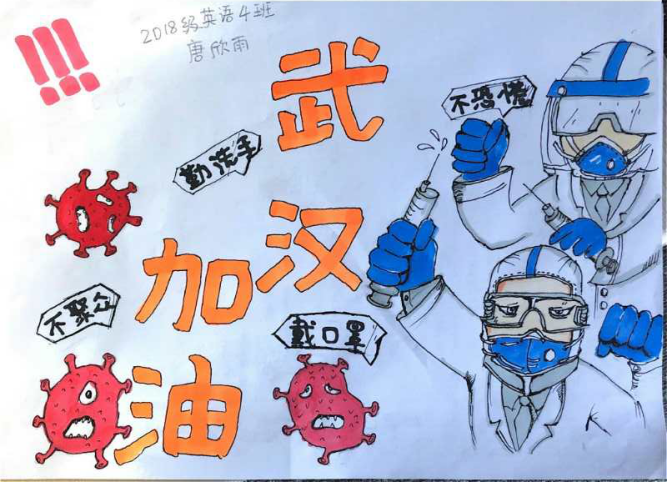 (三)活动形式:创作与防控疫情有关的书法及绘画作品,也可摘抄有关于“抗击疫情,为武汉加油,为中国加油”的英文美文。