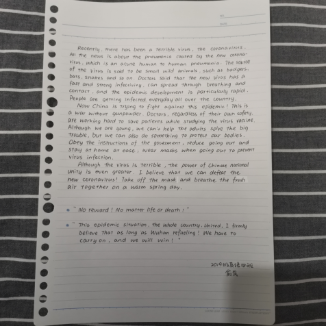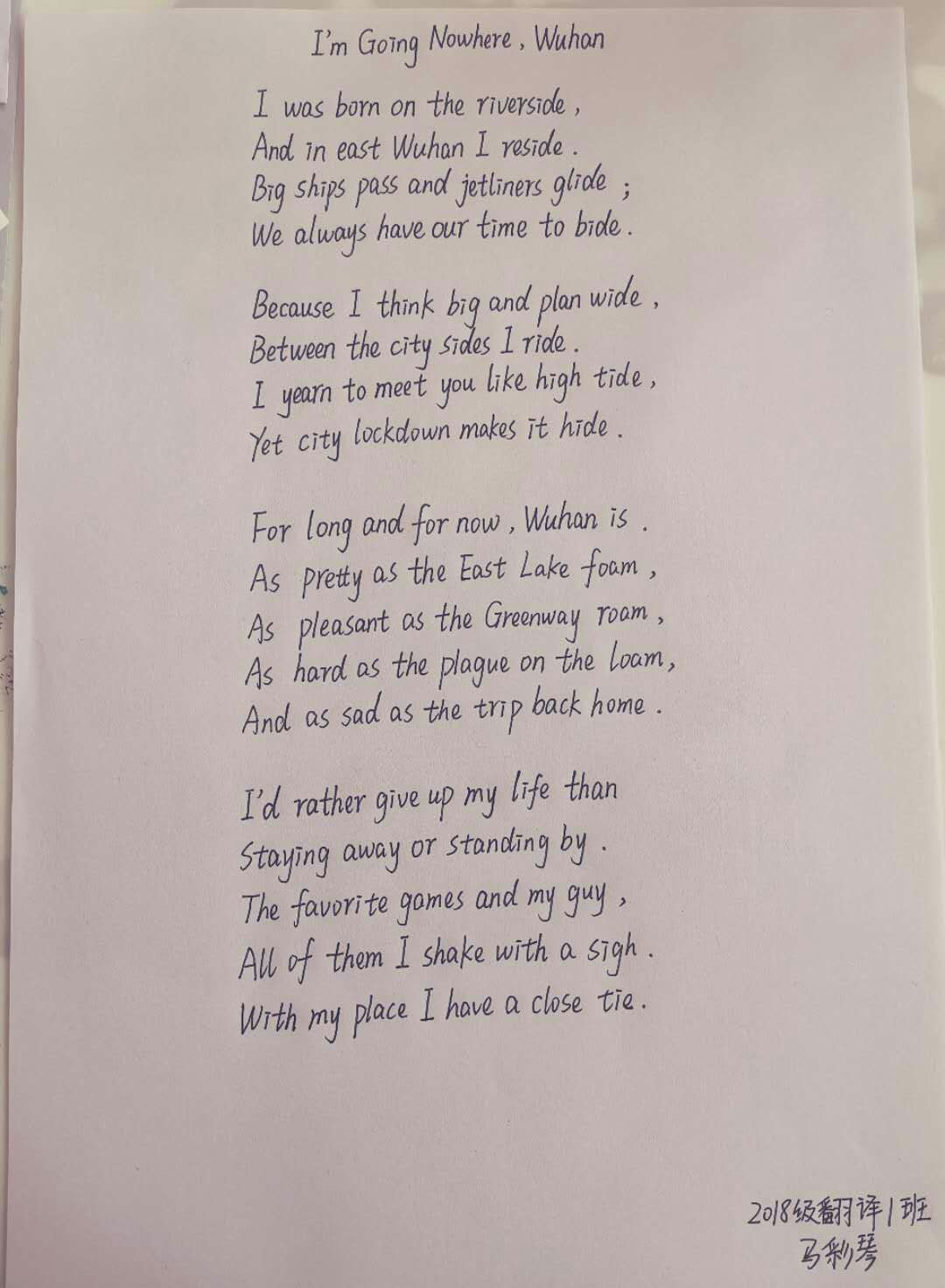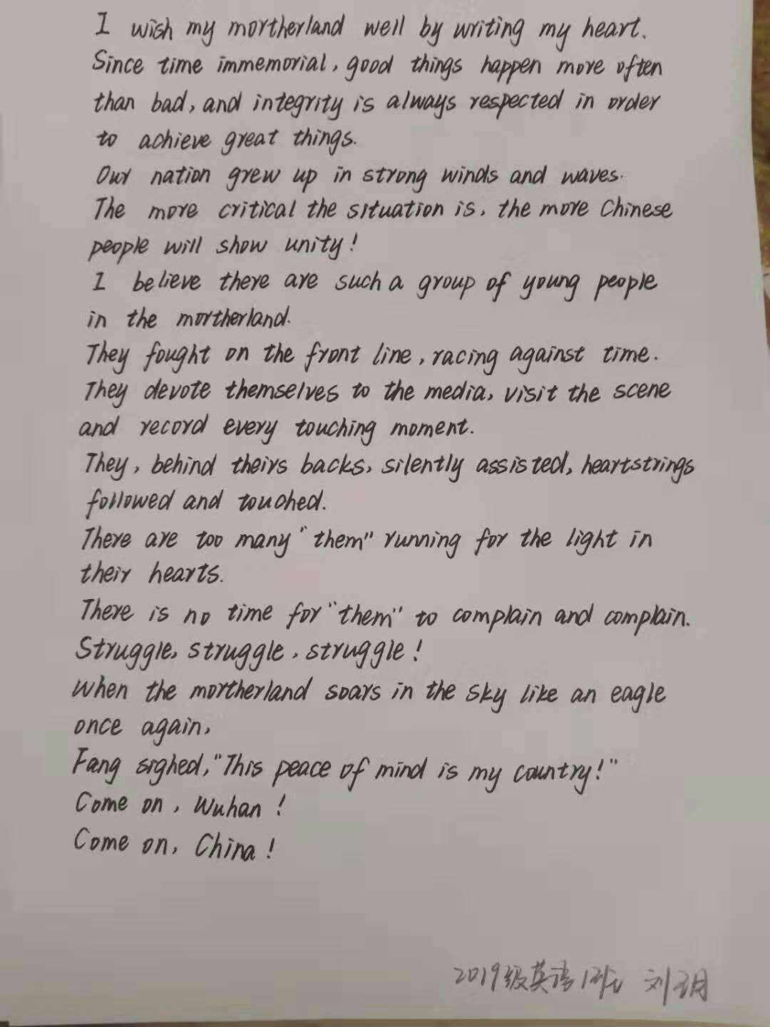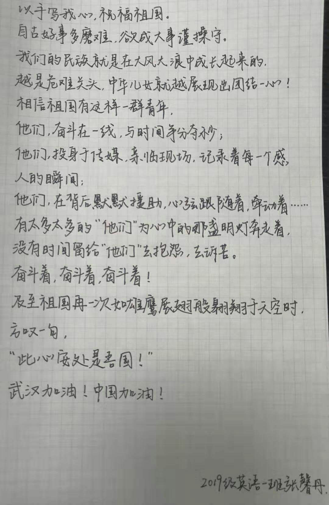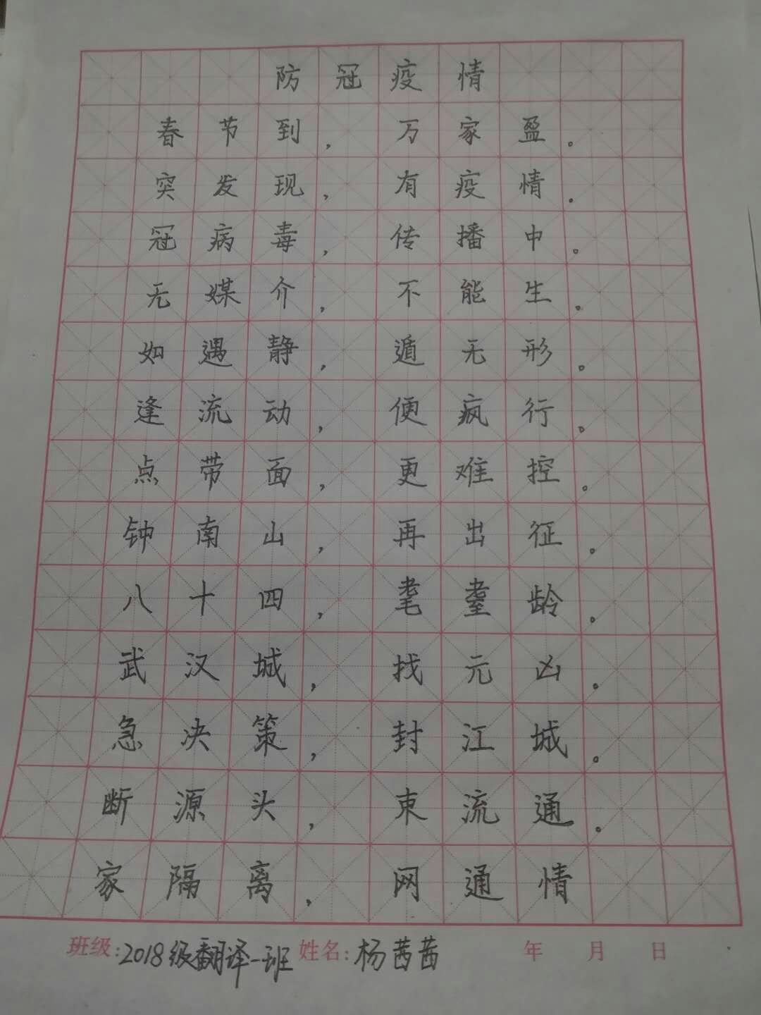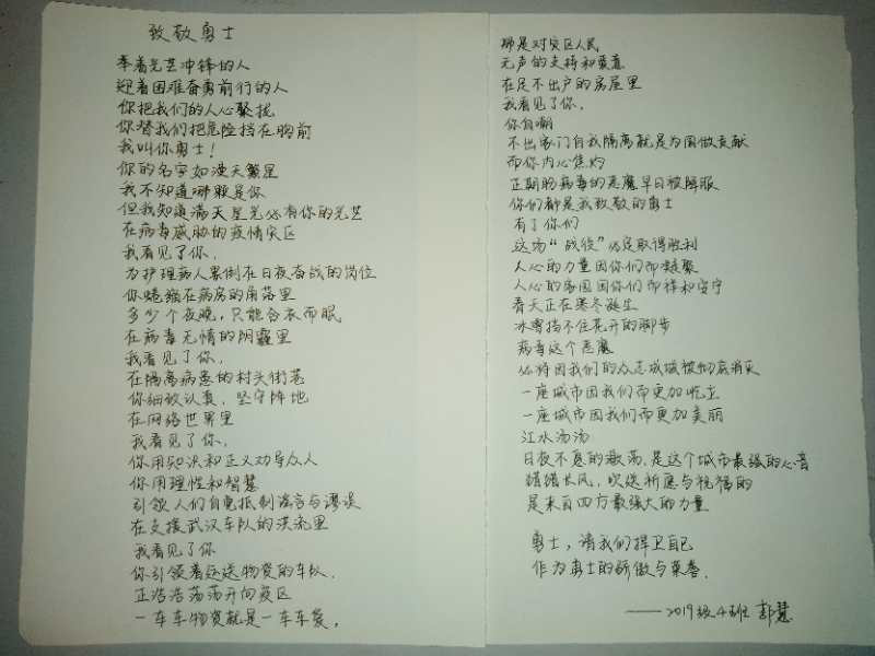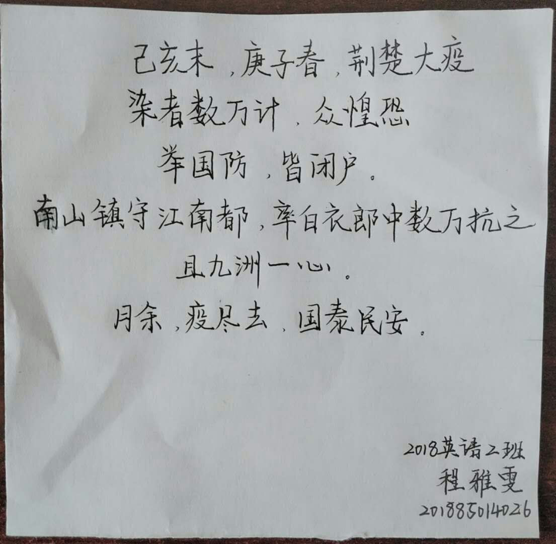 (三)活动形式:创作与防控疫情有关的书法及绘画作品,也可摘抄有关于“抗击疫情,为武汉加油,为中国加油”的英文美文。