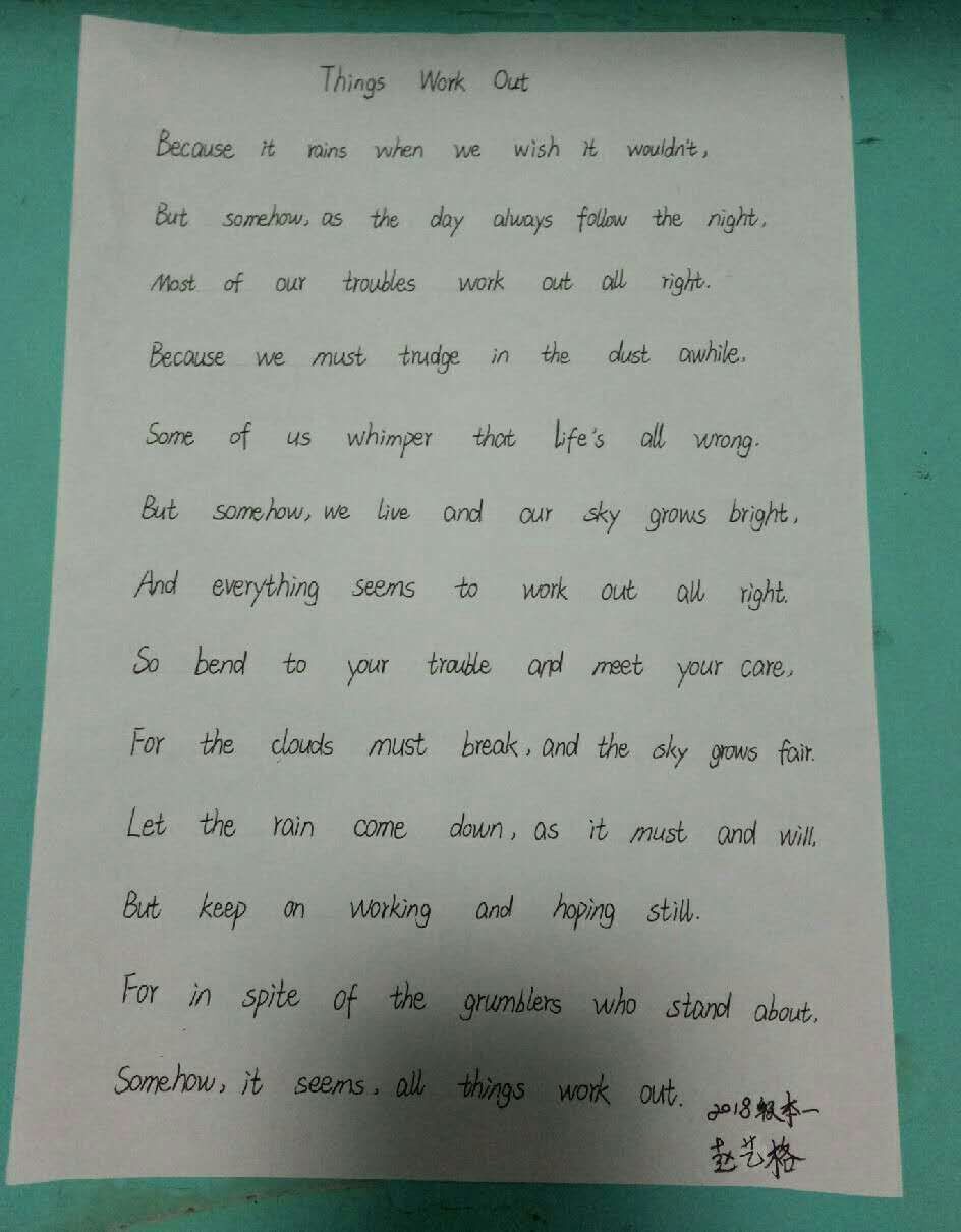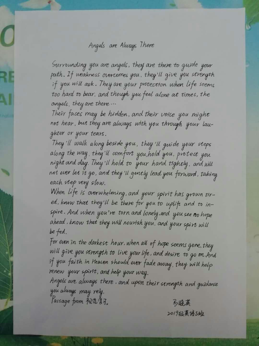 3、数量:2018—2019级每个班至少提供两份作品,2016—2017级采取自愿,书法、绘画、美文摘抄三种方式任选且不能重复。作品右下角须注明班级和姓名。