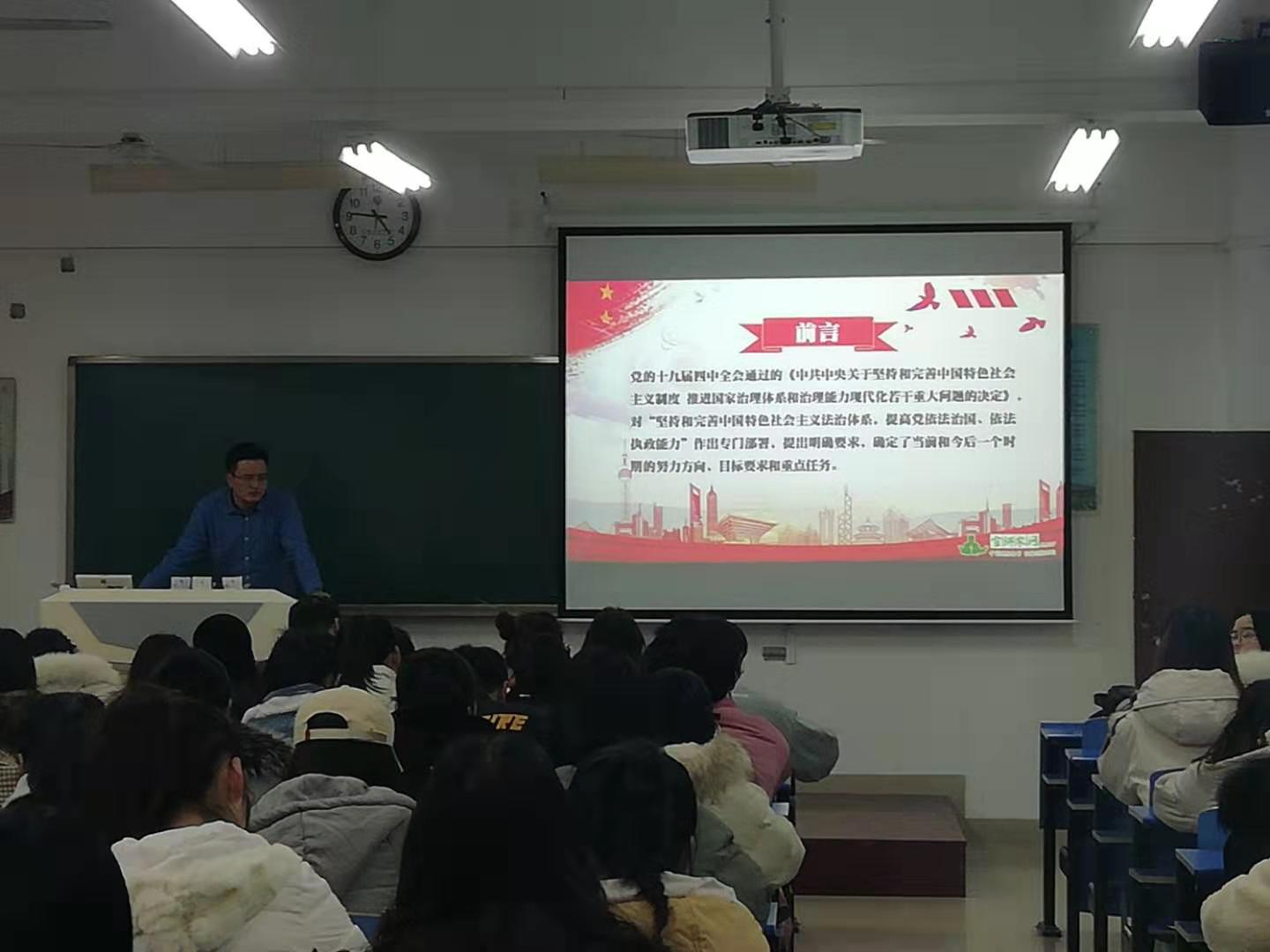 12月18日下午,我院在立心楼426教室举办十九届四中全会精神宣讲报告会。学校理论宣讲团成员段振东博士应邀做了题为《贯彻落实十九届四中全会精神推动法治政府建设》的辅导报告。报告会由学院党委书记孙勇民主持,全体党员、入党积极分子一百余人聆听了此次报告。